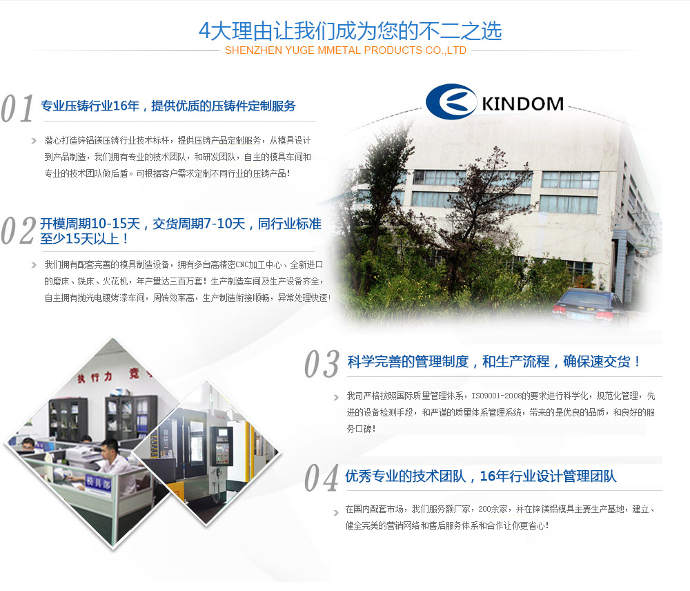 浙江錦恒金屬制品有限公司前身為海寧長命摩擦材料有限公司,創建于2002年,是一家集模具設計、制造、鋁合金、鋅合金壓鑄、沖壓加工、表面處理為一體的專業制造公司,為汽車、摩托車、沙灘車、燈具、網絡天線、監控設備等行業提供精密壓鑄件及精密沖壓件。